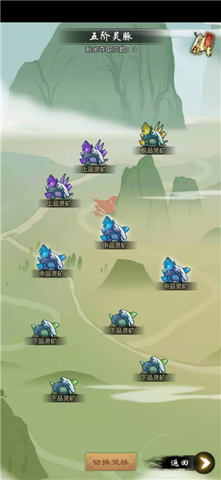 因为每个灵脉地图里面只有10个灵矿,等级从差到好划分分为下品、中品、上品、极品灵矿,数量依次是4下3中2上1极分布方式。