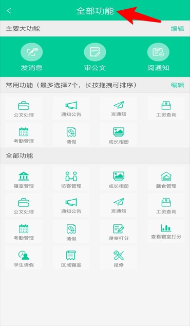 2、点击“全部功能”可查看包括发消息、查成绩、请假等在内的各项教学与管理功能。