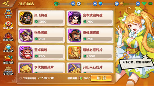 《萌将风云》中的集市因产品众多,分为集市、演武商店、深渊商店、荣誉商店、龙魂商店以及军团商店。玩家通过各种手段获得代币后,便可在其中换得武将将魂。