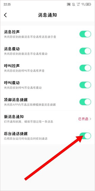 3、在消息通知页面,点击后台通话提醒选项开启。
