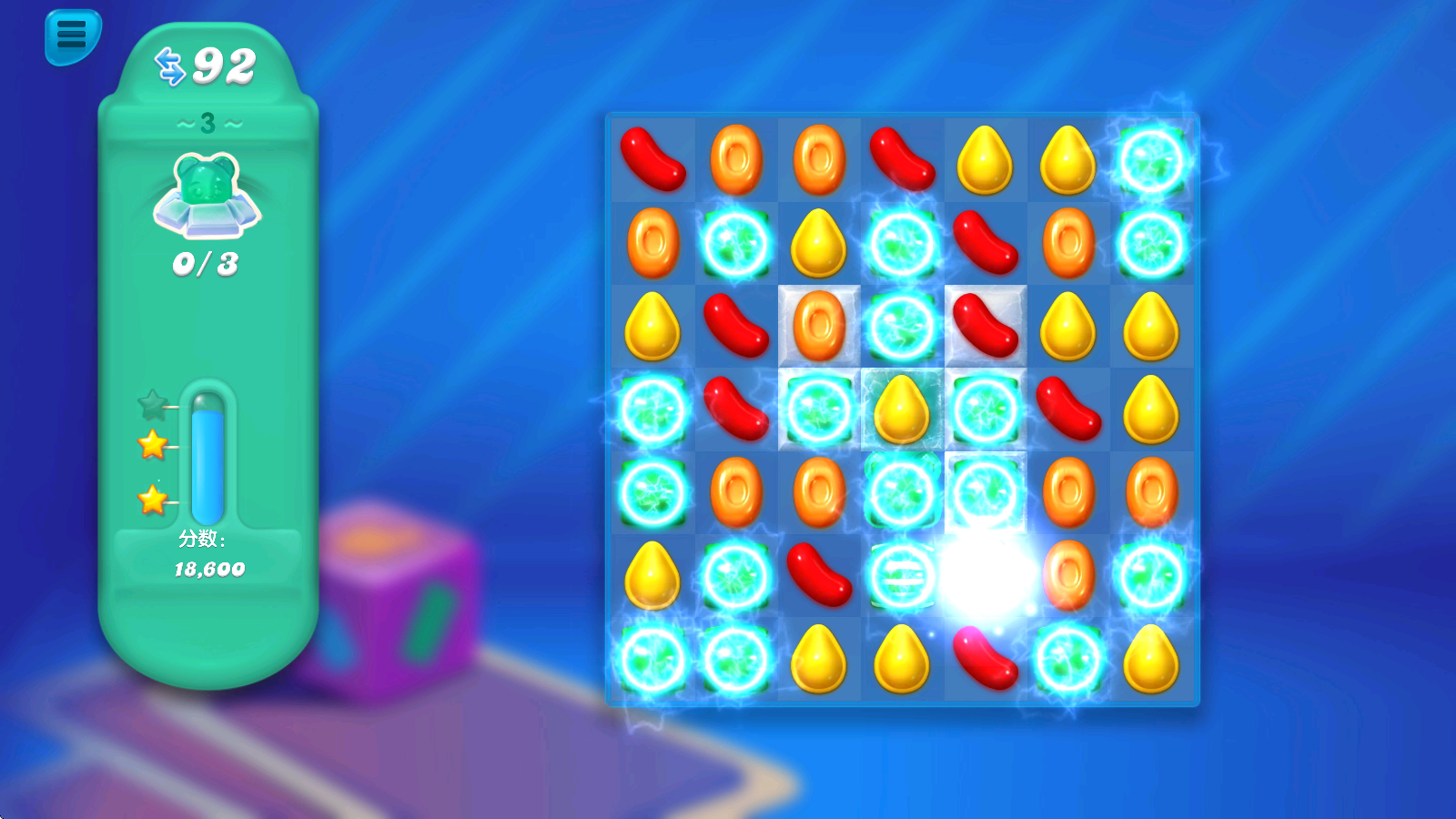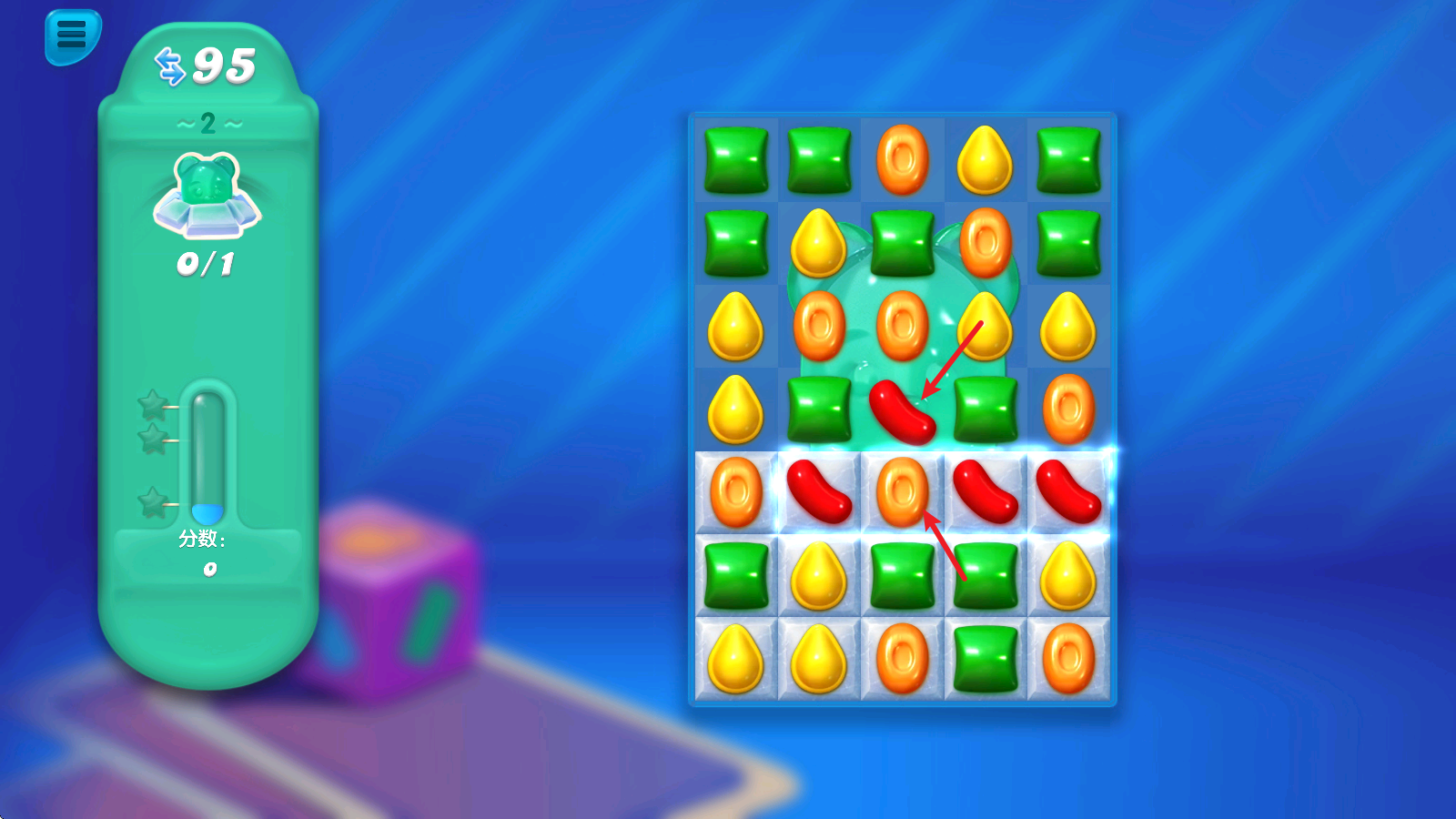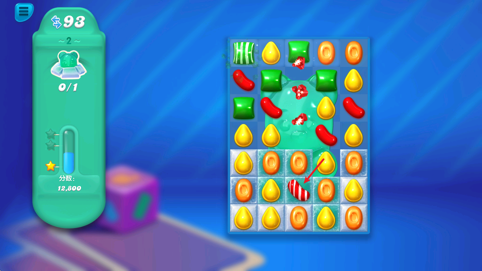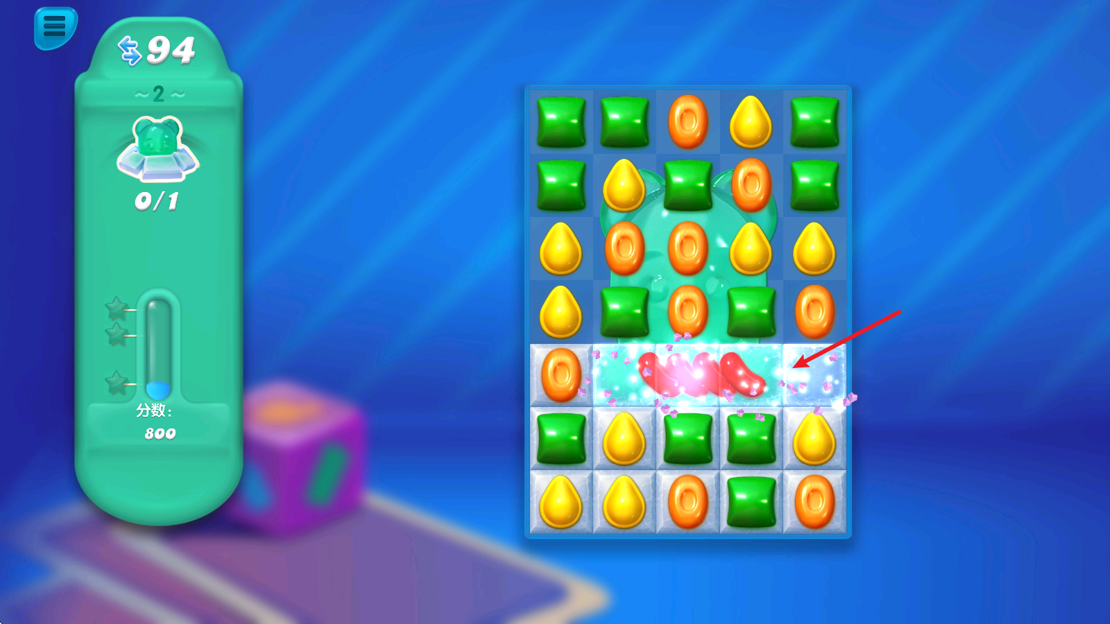 1、进入关卡后,左侧就能看到本关的挑战目标,收集隐藏在冰块后面的小熊软糖。