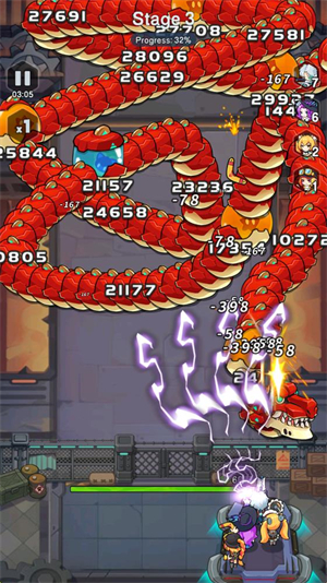 2、进入关卡后角色会自动攻击出现的敌人,当消灭某些部位后会获得技能强化或者获得新英雄。