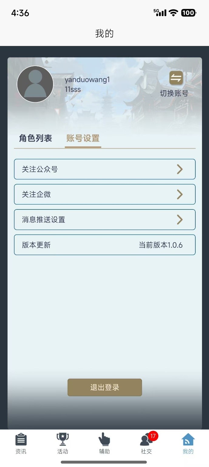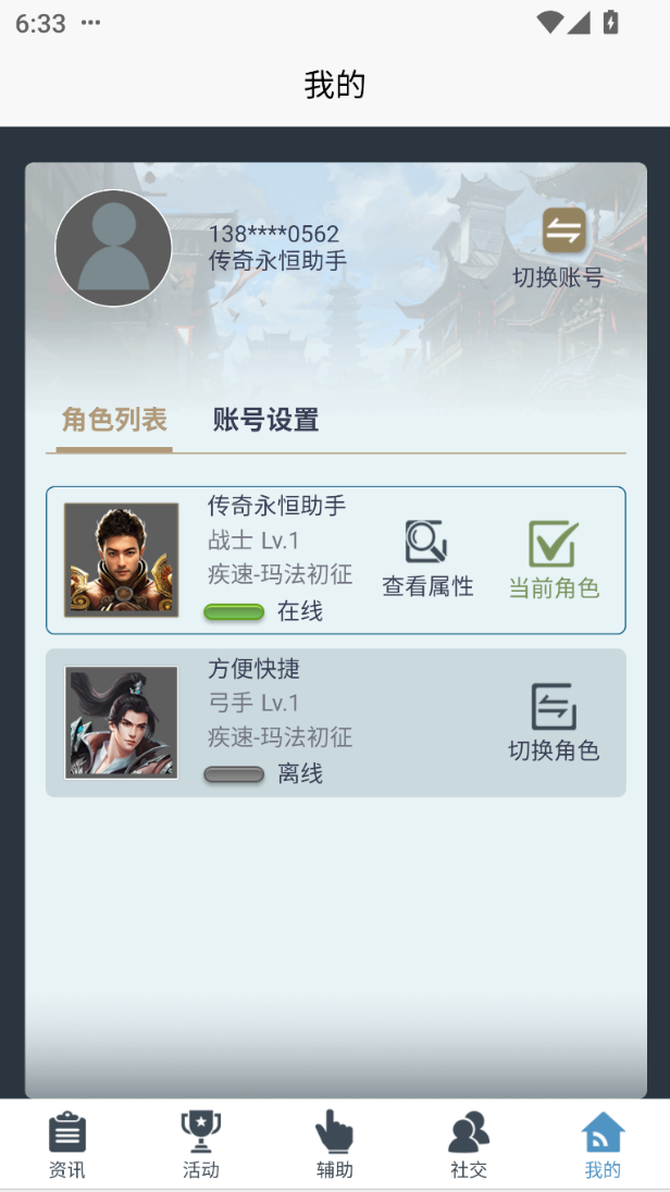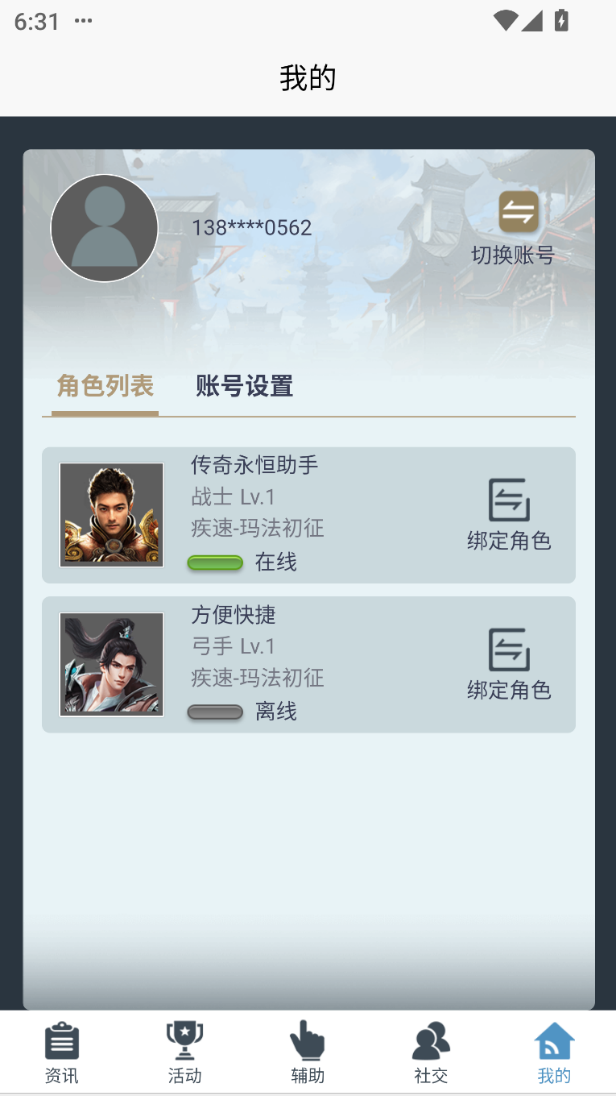 【我的页签】完成账号登录后,需先进行角色绑定,在我的页签内包含“角色列表”和“账号设置”两个功能页。角色列表会显示您近期内登录过的角色,并显示角色的等级、区服和在线状态。 选择在线的角色进行绑定可以使用更多的助手功能。不在线角色除可以参与每日金蛋活动,其他功能无法使用。
