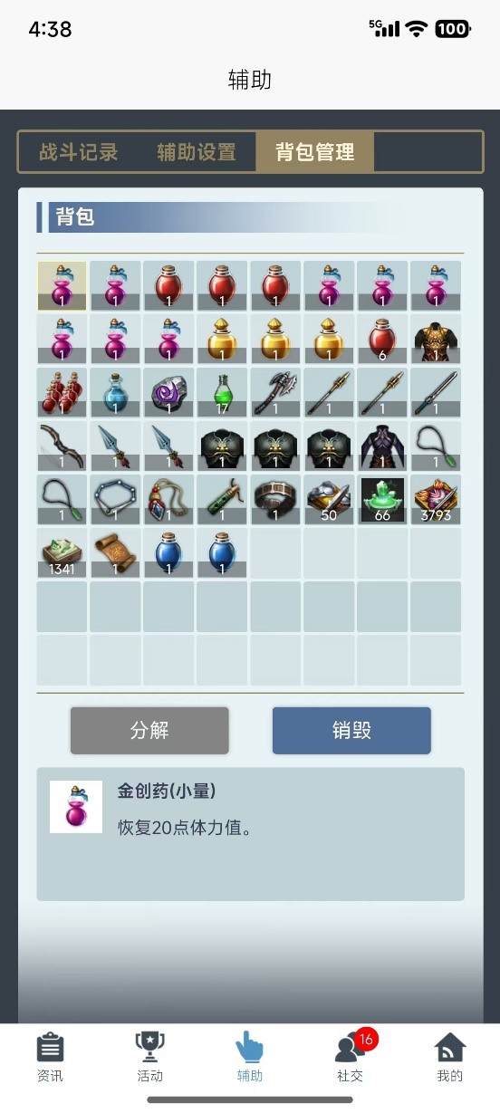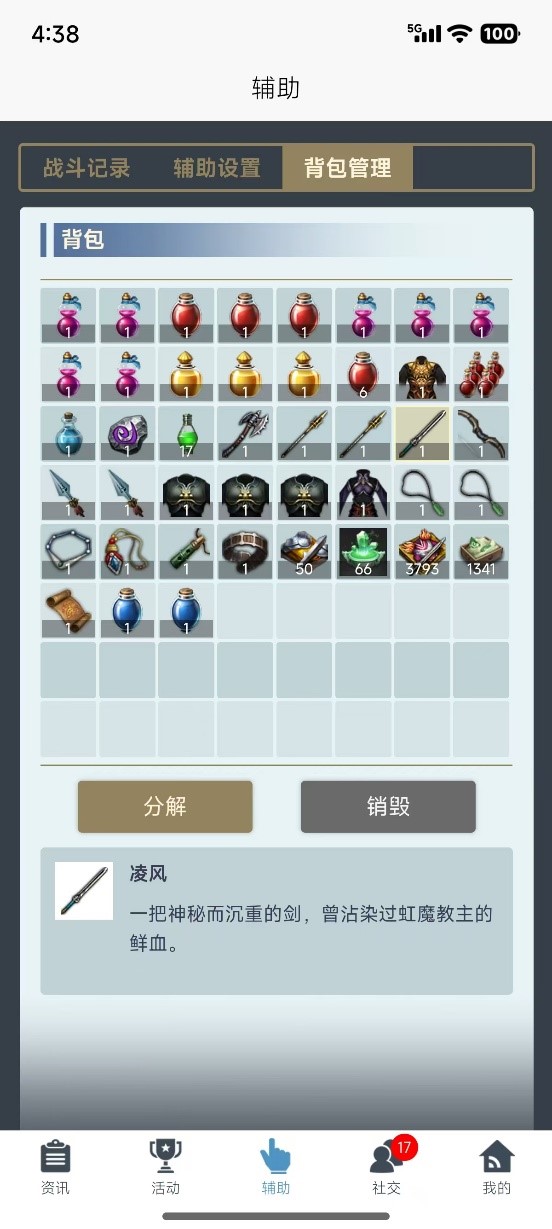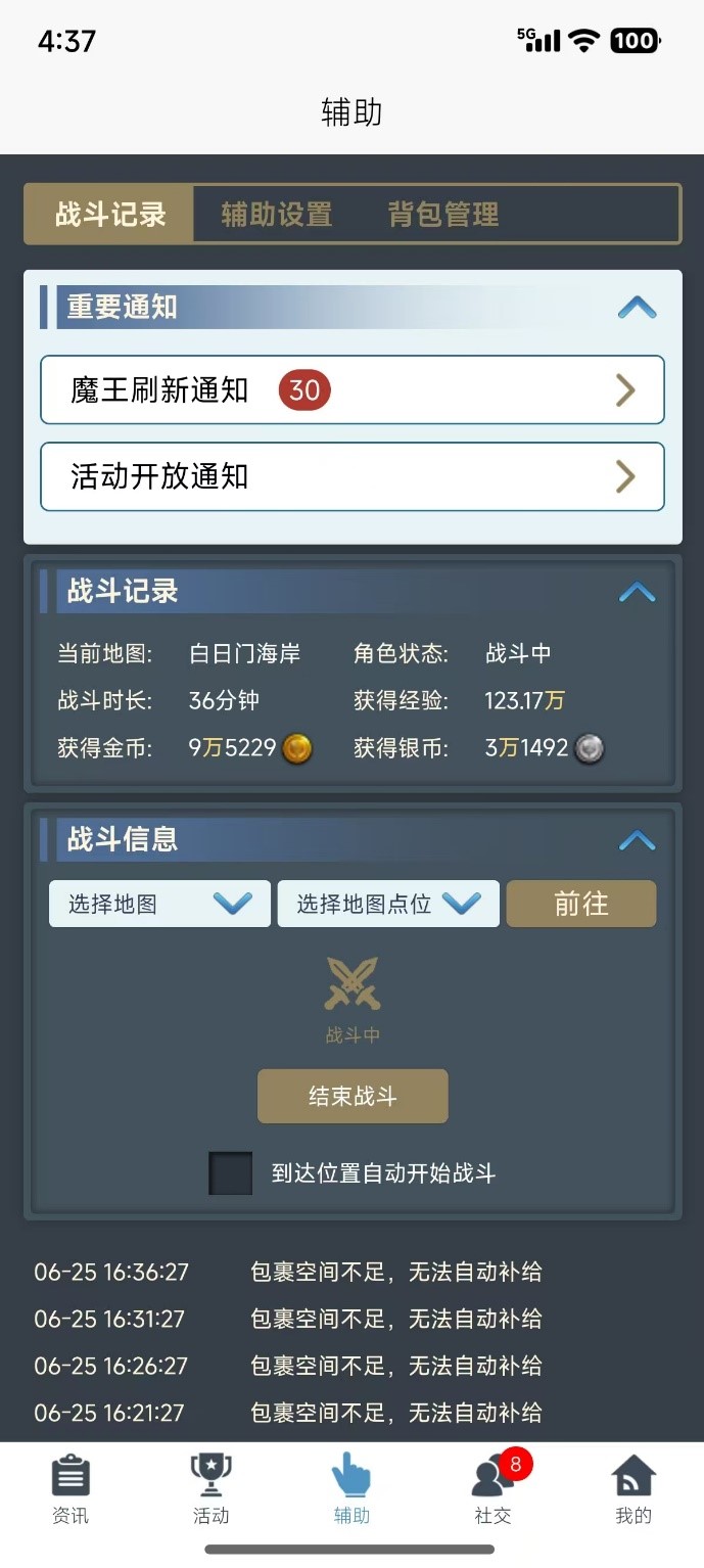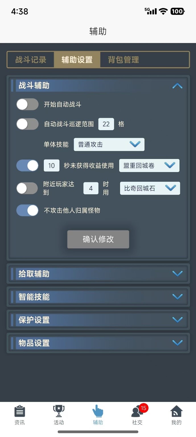 战斗辅助与背包管理在“辅助”页签中,玩家可以查看战斗记录,了解自己的战斗状态和收益情况,同时可以进行战斗辅助设置、拾取辅助、智能技能和保护设置等调整。这一功能无疑为那些希望提升战斗效率的玩家提供了便利。