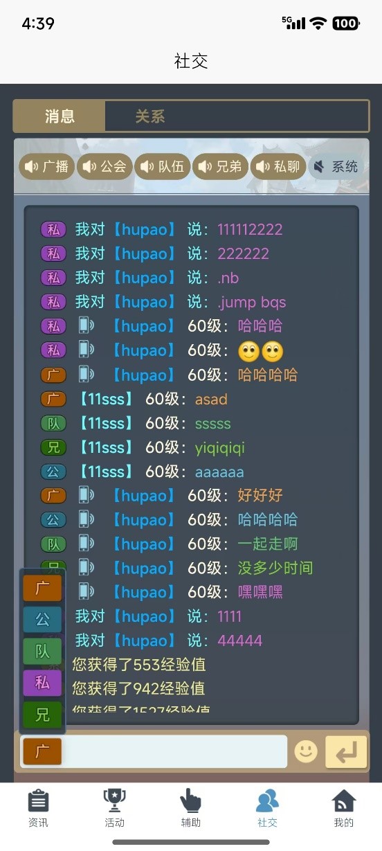 【社交消息】 消息频道包含广播、公会、队伍、兄弟、私聊和系统,对不想收到消息的频道可以进行屏蔽。通过助手进行发言在聊天界面显示中会有一个手机图标标志进行区分显示。