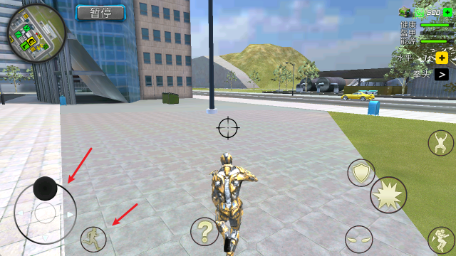 1、进入游戏后,通过左侧的摇杆控制移动,还可以通过其他按钮进行跑步、跳跃等。