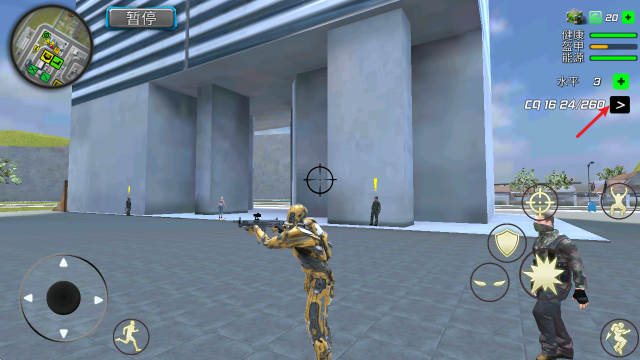 3、随后进入游戏后,我们点击右侧的黑色箭头即可切换武器。