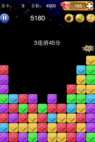 玩法:点击相同颜色(至少两个)在一起的星星即可消除获得分数,连消的块数越多,奖励的分数也就越高。