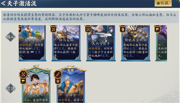 1、天子激活流:核心:天子车舆、白马义从、大内弓箭手、精锐南蛮骑兵、夸父。过渡:虎伥、陷阵营。