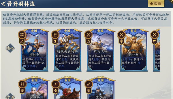 2、晋升雨林流:核心:神射手、白马义从、精锐南蛮骑兵、羽林军、虎候。过渡:长戟兵、轻骑兵、重步兵。