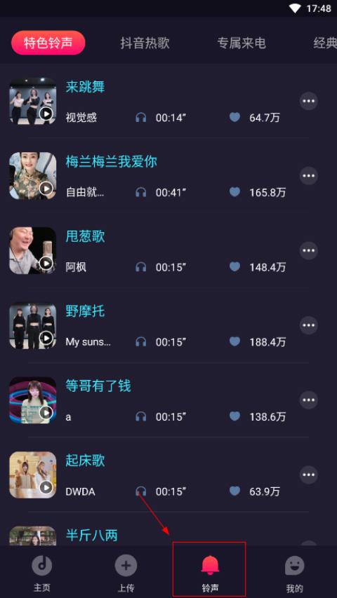 1、打开来电秀视频铃声,点击右下角【铃声】;