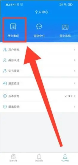 3、证书密码设置后回到个人中心界面,点左上角待办事项;