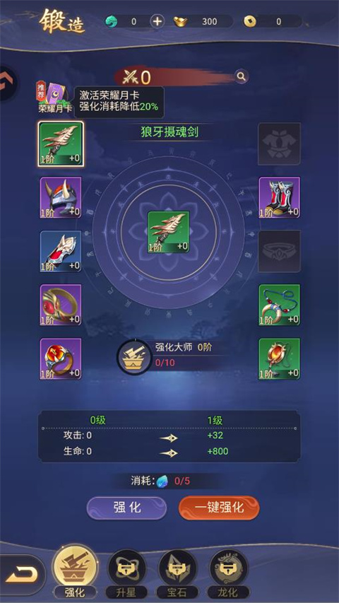 1、熔炼:一键熔炼零星装备,获取强化材料