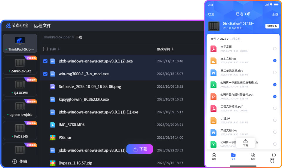 远程文件管理:随时随地浏览、上传、下载电脑或NAS中的文件,支持大文件传输。