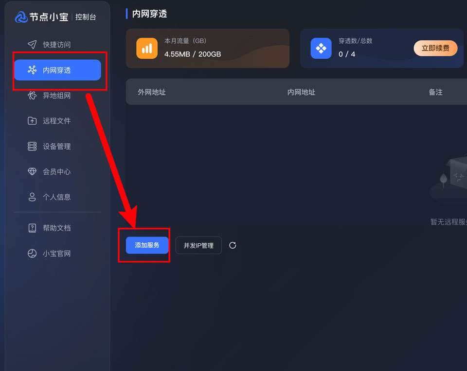进入 "内网穿透",点击"添加服务"节点小宝