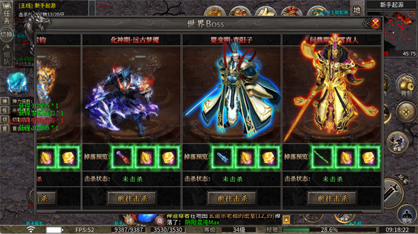 点击【前往击杀】世界Boos挑战,世界Boss可掉落神格碎片、高阶武器快速提升角色装备品质。