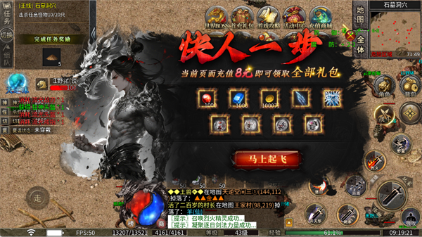 点击【领取新手礼包】可获取自动拾取、自动回收、打怪+1500%等基础Buff,为前期发育提速。