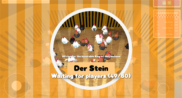 80名鸡玩家争夺最后一个站在可怕的研磨机上方不稳定圆盘上的玩家。圆盘上最后一个站着的玩家不会被变成鸡块。成为排行榜第一名,你将获得一顶金色王冠作为奖励。