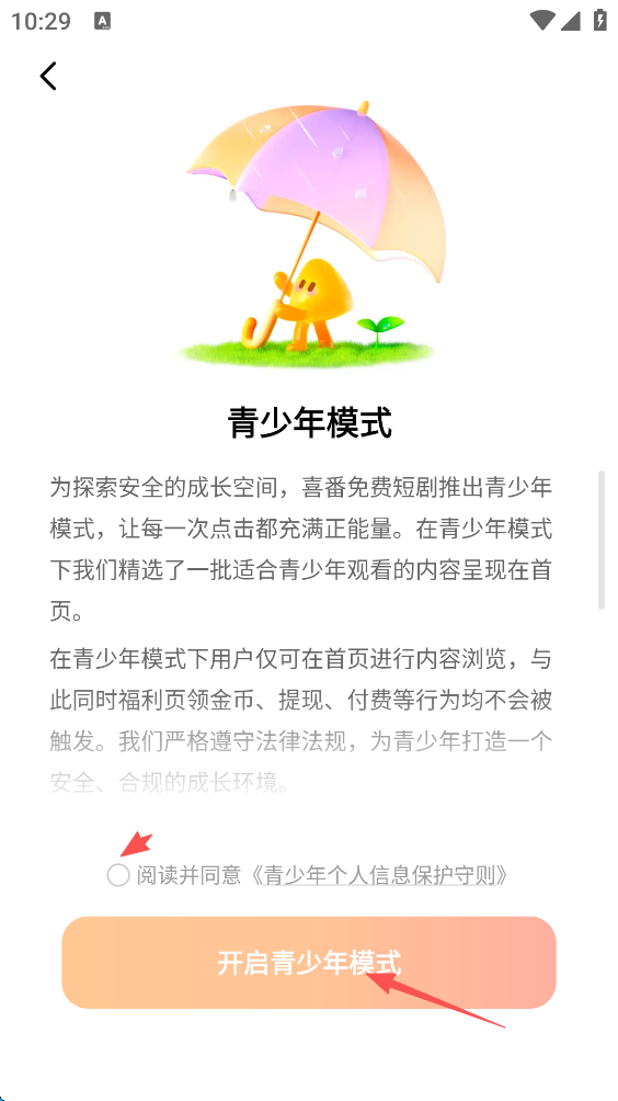 4、点击屏幕下方的“阅读并同意”,随后点击“开启青少年模式”。