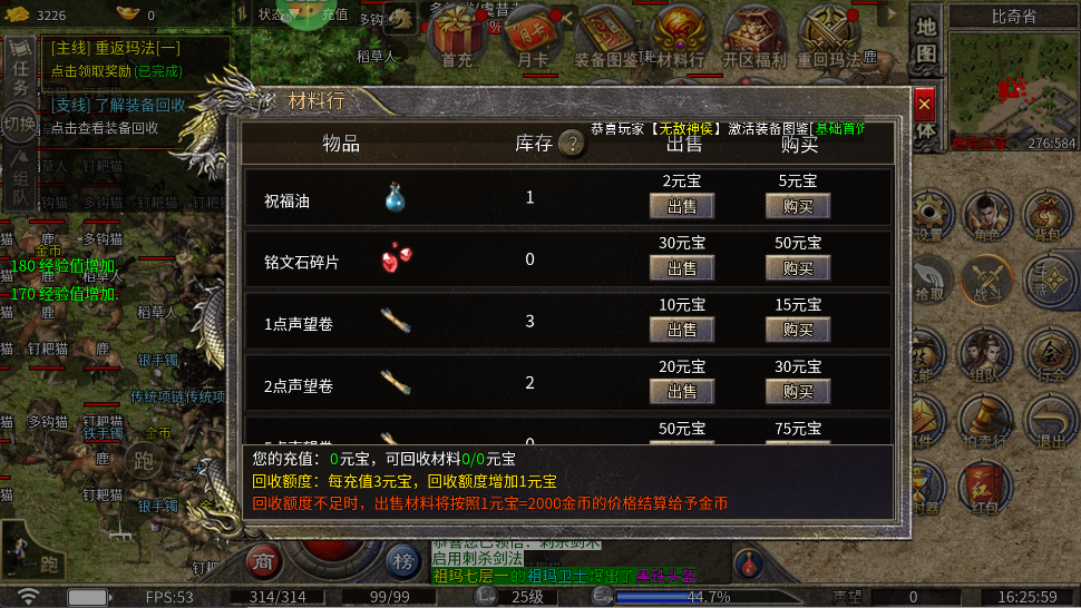 游戏中设有 【实物回收】 机制,打怪掉落的道具可以直接回收兑换灵符等游戏货币,实现了“打怪就能赚钱”的经济循环,对散人和搬砖党非常友好。