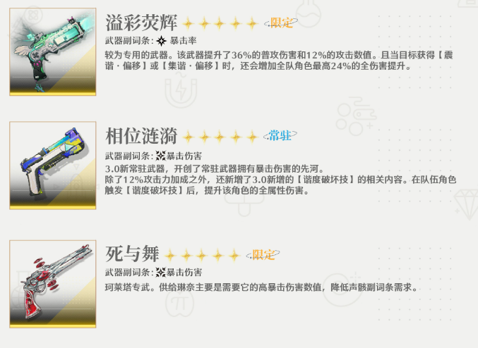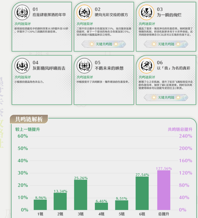 释放大招所有角色的伤害加成提升24%,持续30秒;释放视觉冲击时所有角色谐度破坏增幅提升40点,持续30秒;延奏下一个登场的角色全伤害加深15%,共鸣解放伤害加深25%,持续14秒,若切换至其他角色则该效果提前结束。