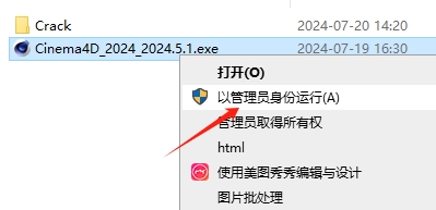 1、选择安装程序“Cinema4D 2024 2024.5.1.exe”鼠标右键以管理员身份运行。