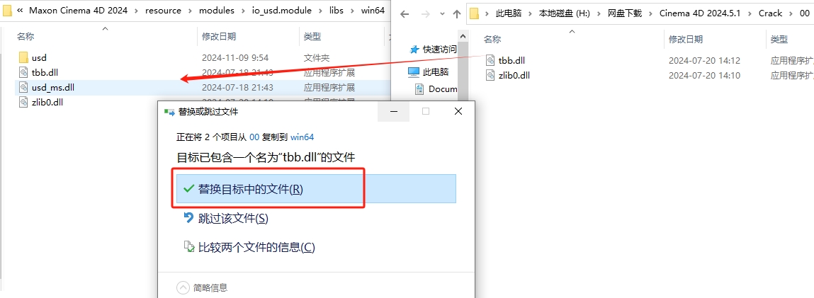 11、将文件夹里面的2个补丁全部复制到刚才安装目录位置打开的win64文件夹下替换。