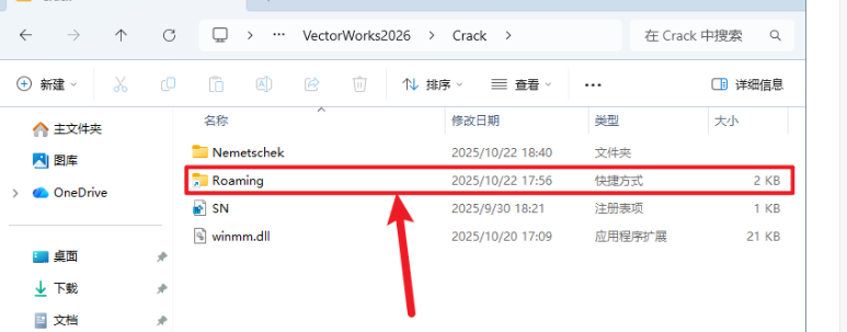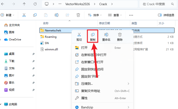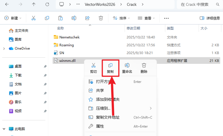 11、打开安装包解压后的【VectorWorks 2026(64bit)】文件夹中的【Crack】文件夹,鼠标右击【winmm.dll】选择【复制】