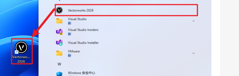 12、创建桌面快捷方式:①点击桌面任务栏中的【开始图标】>点击【所有应用】②将【VectorWorks 2026】图标拖到电脑桌面