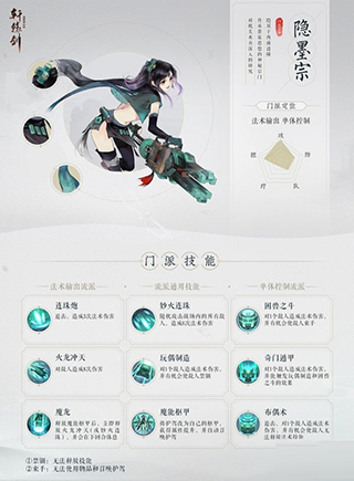 特点:隐墨宗主角擅长法术输出和机关术伤害,天师道提供法术输出和控制,白泽提供稳定治疗。
