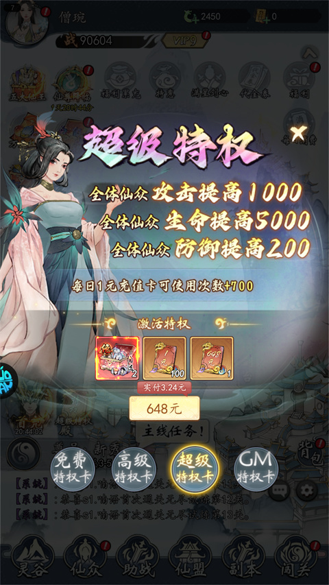 ★提升【等级】:普通玩家不用花钱也能通过主线秘境关卡征战天下、完成任务栏里面的二大任务(日常/成就)可获得充值卡;有条件的大侠,可以购买快速收益特权,等级升得越快,就能解锁越多的玩法、资源,建立早期优势。