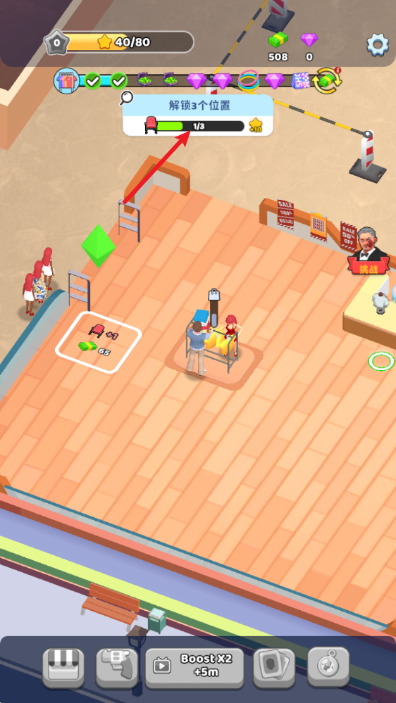 1、进入游戏后,拖动屏幕即可移动角色,花费钞票来建造自己的店铺。