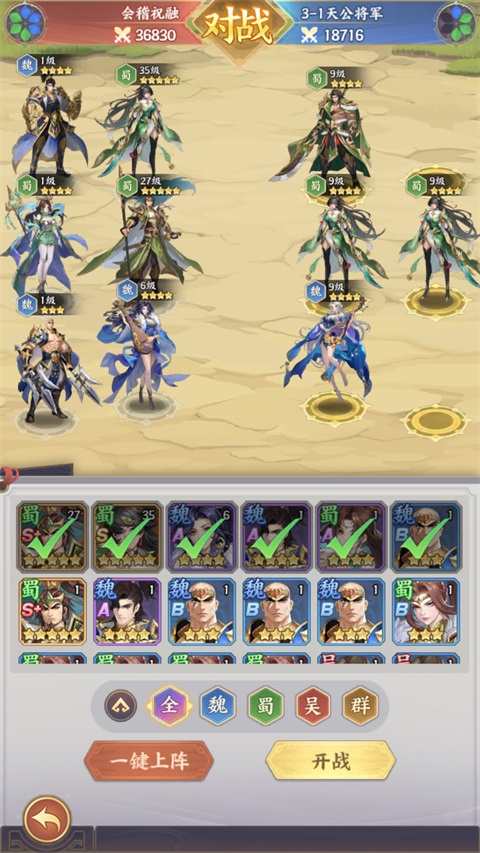 玩家可根据武将阵营(魏/蜀/吴/群)、品质搭配出战阵容,合理布阵是通关关卡、提升战力的核心,同时支持一键上阵、多队伍布阵等便捷功能。