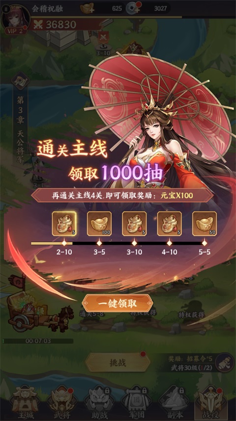 玩家通过推进主线关卡解锁游戏内容,通关关卡可领取招募令等奖励,同时主线进度是解锁其他玩法、提升主公等级的核心前提。