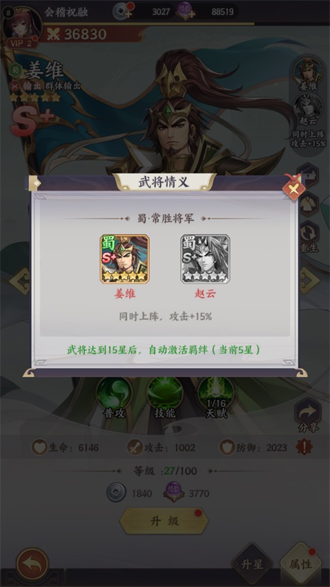姜维不需要练太高星级,8星足够,后面当狗粮让赵云吃掉,让赵云升到15星。