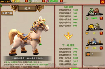 萌将冲冲冲的坐骑在擂台、神兽饕餮的活动中提高武将以小兵的能力,随着坐骑的升级,可以提高所有战斗中主角回血速度。