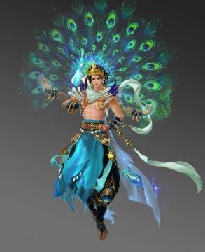 孔雀明王作为人形召唤兽,既有显露佛祖灵气,又有孔雀的艳丽,庄严中不失色彩,飘逸中带着厚重。战斗中的孔雀明王则更为霸气,一只金黄色的佛手击出,将佛之本色凸显无遗。