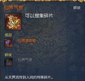可以看到,仙界气息是不完整的碎片,合成可以获得仙界遗物箱,然后我们继续去搜索仙界遗物箱。