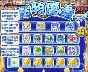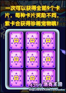2、在点击转动魔盘的时候,一次可以获得全部9个卡片,每种颜色卡片的奖励都不同,抽到紫卡的将会获得珍稀宠物。在9个卡片确定下来的时候,会随机一种奖励方式(右边),这时候需要你完成他要求的奖励方式才可获奖哦~