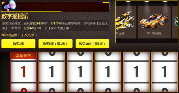 3、玩家点击开始摇奖,首先幸运数字滚动,然后玩家的5个数字(5个数字是从0-9中选出的5个不同数字)滚动,若玩家的5个数字中有1个数字跟幸运数字相同,即可必得【极品大奖】中任一个,若玩家5个数字的最后一个数字是 6 ,即可获得【欢乐大奖】任一个,若都不满足,将获得以下奖励中随机一个: 复仇之钻LV1、效率宝珠LV1、宠物经验卡+500、燃料系统+1、悬挂系统+1、双倍经验卡(1天)、飞行卡(3天)、鲜花卡5个、祝福小喇叭5个或300点券。