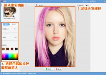 只需进入染发功能界面,选择合适的画笔大小,再挑选一个喜欢的颜色,涂抹头发即可哦,而且涂抹之后可以直接点击色盘,就能随意变换想要的发色啦!很方便哦!