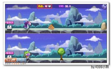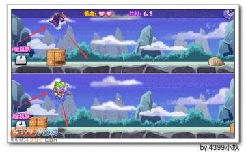 游戏开始啦,妖姐很顺利的使两只妖怪跳过第一个障碍物。