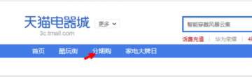 3、我们点击电器城以后,进入到天猫电器城的首页里面,然后我们会看到上面有一个分期购。然后点击一下,进入到电器城的分期购下面。