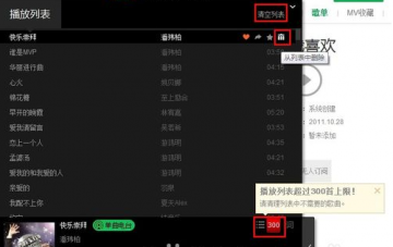 6、播放列表清单只可以容纳300首歌播放,如果需要再添加,必须清理一些出去。鼠标移到要清理的歌曲列表上,右边的最后一个按钮可以清理当前歌曲。
