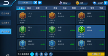 点击左边分页“芯片推荐”可查看各英雄的推荐配置。点击“芯片背包”可查看所有芯片,并且可出售已拥有的芯片。芯片目前可通过商城花费“稀土”购买。“稀土”可通过对战、芯片出售获取。