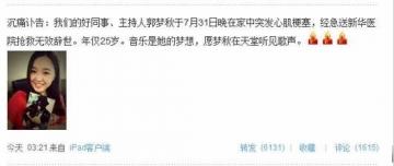 继之前的年轻淘宝店主因为日夜工作猝死后,近日又一噩耗传来,浙江卫视年仅25岁的女主播郭梦秋因为操劳过度于7月31日晚在家中突发心肌梗塞,经医院抢救无效辞世。