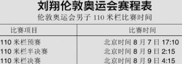 刘翔在奥运会中的表现可谓是牵动着无数国人的心,从上次北京奥运会刘翔因为腿伤无奈退赛后,对于这次奥运会,人们担心是否退赛的梦靥又会重演呢?下面是刘翔在本次奥运会中的赛程安排: