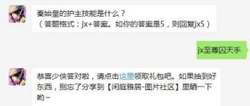 剑侠情缘手游每日一题今天的问题是秦始皇的护主技能是什么,很多小伙伴还不知道答案,小编给大家带来了答案介绍哦。