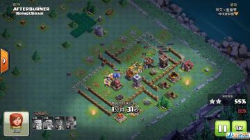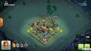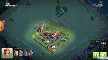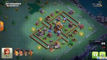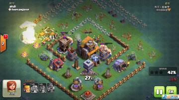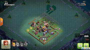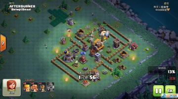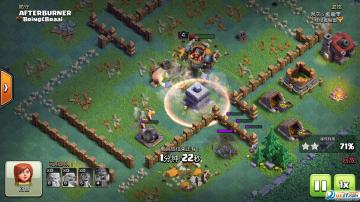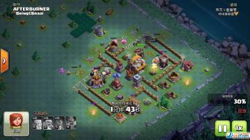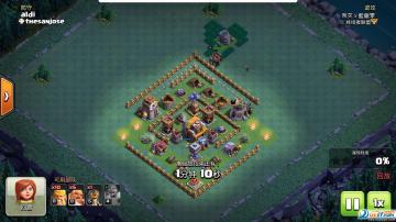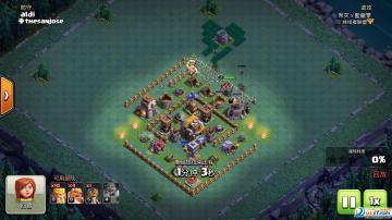 2、选好方向角度位置先放王或胖子抗加试隐身炸弹,然后炸弹开墙(这里注意别让王去抗两个双管的伤害,最多只能抗一个,要不然清防御的任务只能待清边后的野蛮人清边加爆大本了)