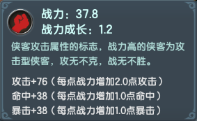 如图所示,侠客的战力决定侠客的攻击、命中、暴击属性。侠客的意志决定侠客的生命、防御属性。侠客的悟性决定侠客的内力、闪避、抗性属性。